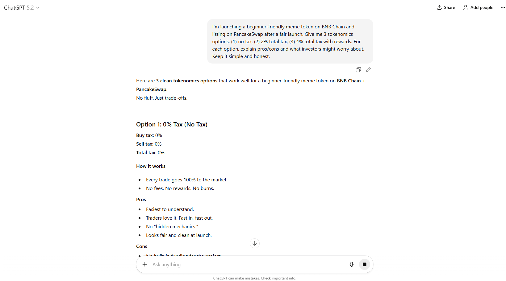 “I’m launching a beginner-friendly meme token on BNB Chain and listing on PancakeSwap after a fair launch. Give me 3 tokenomics options: (1) no tax, (2) 2% total tax, (3) 4% total tax with rewards. For each option, explain pros/cons and what investors might worry about. Keep it simple and honest.”
