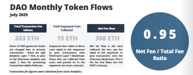 Marking a health and unlike bloated chains that leak fees everywhere, Arbitrum keeps 95% of fees after costs. Thatās sticky revenue. In July alone, the DAO recorded 323 ETH in fees, with 308 ETH in net inflows.