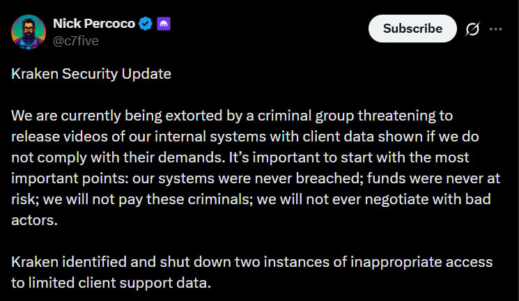 While we’re all watching the charts for that next leg up, we’ve got a major Security Alert coming out of one of the OGs in the space. Kraken just went full "Sovereign individual" mode, publicly refusing to negotiate with a group of bad actors trying to extort them.