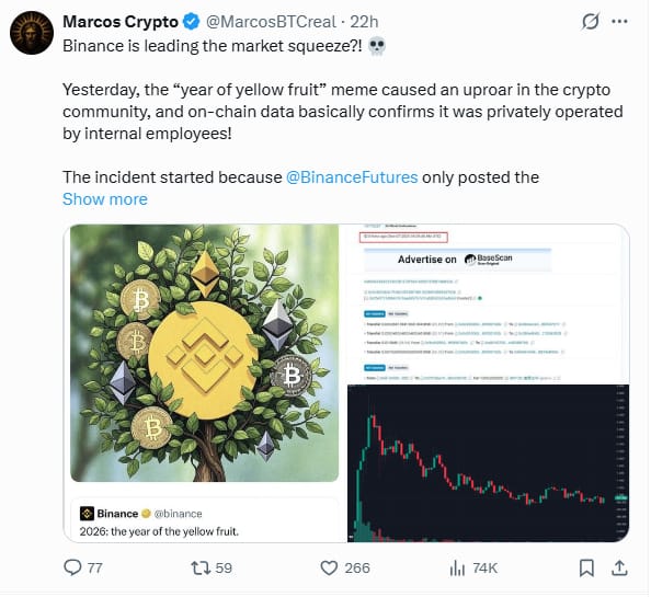 On Dec 4th, the official Binance account posted a quote from Raoul Pal (from Binance Blockchain Week) about planting seeds wisely and harvesting, using a "Yellow Fruit" metaphor.