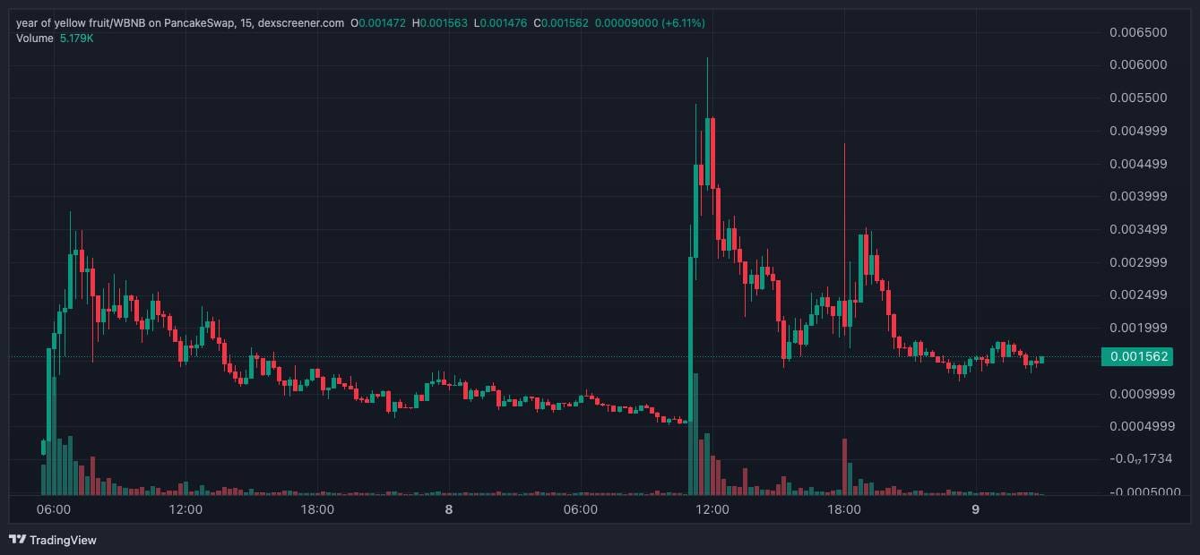 Year of the Yellow Fruit price action on the 15m timeframe. Screenshot via DEX Screener, Dec 9, 2025.