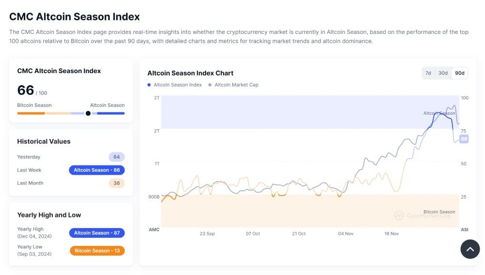There's an "altcoin season index" that tracks when altcoins are doing well. If this index is above 75 → Altcoin season is coming/ is here