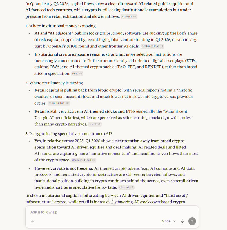 Prompt: Find data on capital flows between crypto and AI stocks in Q1 and Q2 2026.
