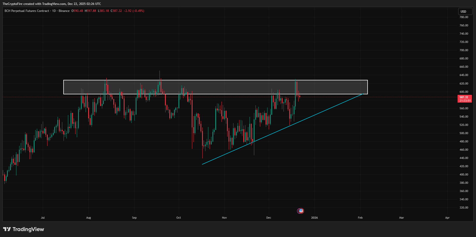 BCH is currently capped by the $590 - $620 resistance zone. If it breaks above this level, the upside could be very strong, especially since price is forming a descending triangle pattern.