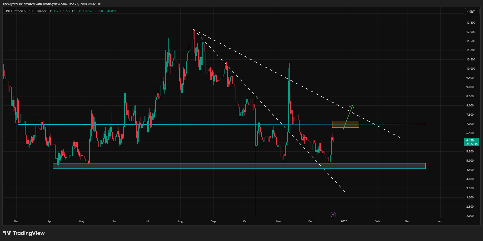 From a technical perspective, UNI is still in a broader downtrend, with multiple downward trendlines in play. A meaningful recovery would require price to first reclaim the $7.0 resistance, then break and confirm above the main trendline with a close above $8.0. For now, price remains in an accumulation zone, and with strong support around $4.4 - $4.8, commonly used as a demand zone in this trading strategy.