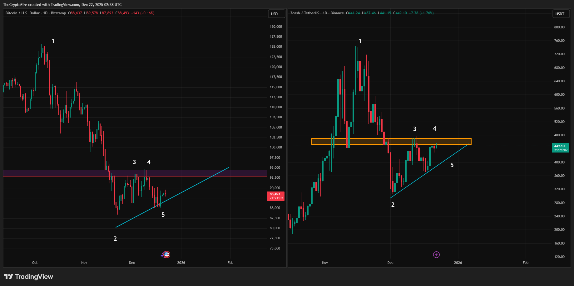 On the $ZEC ( ▼ 15.56% ) chart, the structure closely mirrors BTC. After a strong rally, ZEC corrected deeply and is now consolidating within an ascending triangle. Price is compressing just below a key horizontal resistance zone (highlighted in yellow), signaling a potential expansion move. This setup has started to appear in several latest crypto news discussions