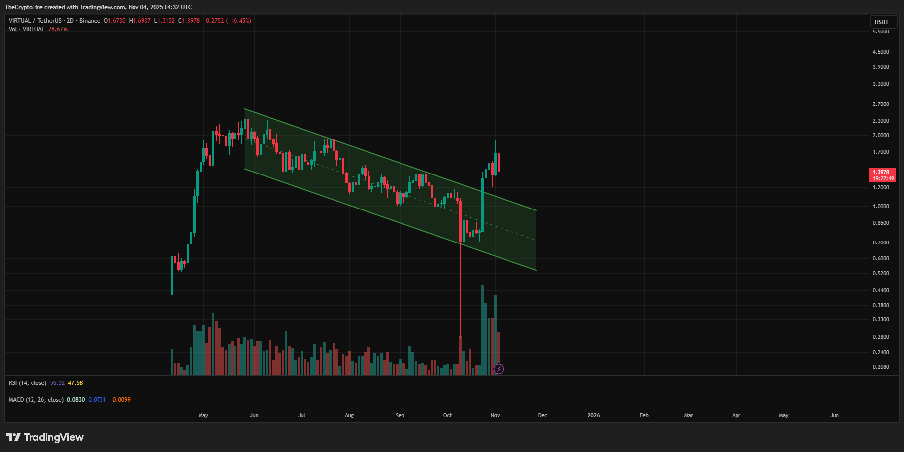 Virtual AI $VIRTUAL.X ( ▼ 4.73% ), on the other hand, is following right behind. Its chart looks like a smaller-scale reflection of TAO’s move with a breakout above the descending channel with healthy volume, followed by a retest of the $1.3-$1.4 support range.