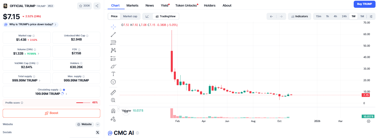 The TRUMP token $TRUMP.X ( ▼ 5.32% ) is currently trading around $7.15, with 24h volume up over 117% to $1.32B. The market cap sits at $1.43B with roughly 200M tokens in circulation out of a total 1B supply.