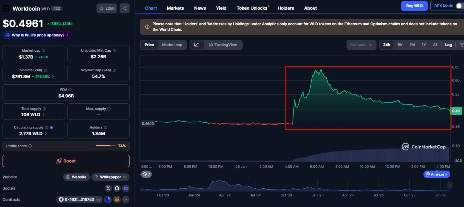 Markets went ballistic. $WLD ( ▲ 10.39% ) ripped +44% instantly, trading up to $0.5+.