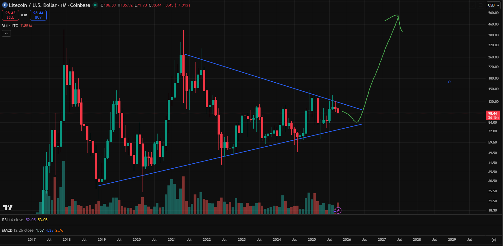 Historically, such patterns often precede strong directional moves. If LTC can break and close above the $120 resistance zone, it would confirm a bullish breakout, likely triggering a sharp uptrend toward $300–$500 over the following months.