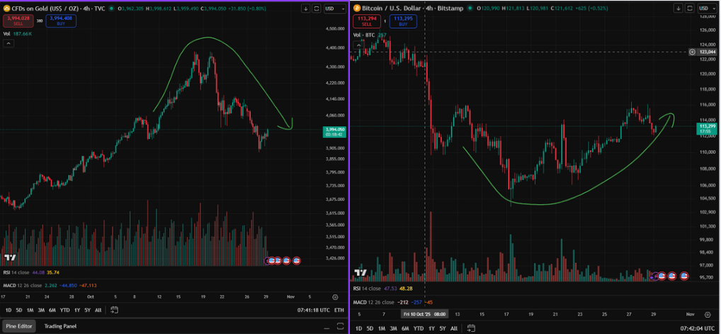 On the right, Bitcoin $BTC.X ( ▲ 10.36% ) is doing the exact opposite. Its price structure has created a clean rounding bottom formation, typically a strong bullish reversal signal in technical analysis. Each dip is being bought up faster, and the lows are tightening, indicating accumulation.