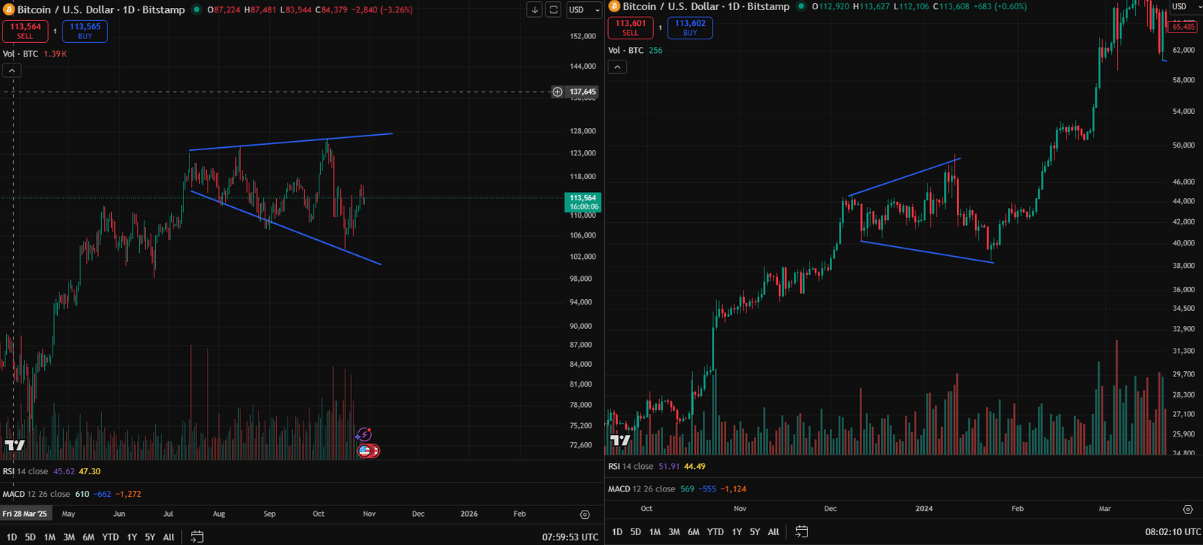 The chart shows Bitcoin is forming a bullish wedge pattern, similar to the setup seen in late 2023 before its strong rally from $49,000 to $70,000. If BTC breaks decisively above the $127,000 level, it would likely confirm a strong uptrend continuation.