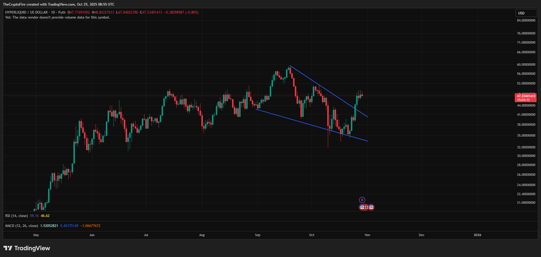 HYPERLIQUID $HYPE.X ( ▼ 2.29% ) shows a clear falling wedge breakout, a classic bullish reversal pattern.