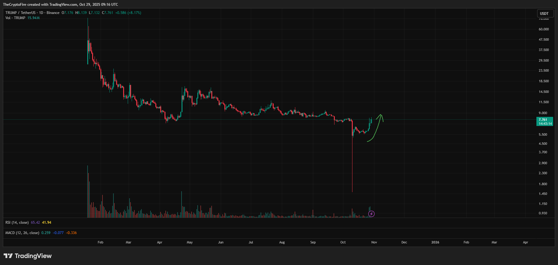 The TRUMP $TRUMP.X ( ▼ 4.32% ) chart shows a strong rebound after months of decline, signaling renewed speculative momentum. This recent surge followed Trump’s pardon announcement, which immediately sparked optimism across political-themed tokens.