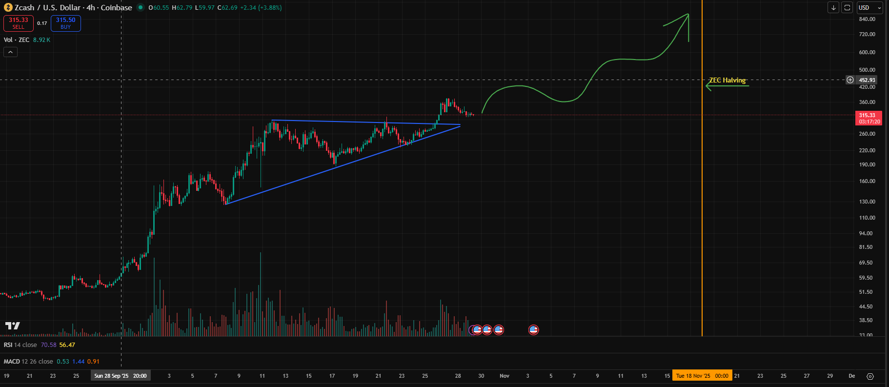 With the ZEC halving set for November 18, 2025, the market typically begins to price in the reduced supply months in advance. This could drive ZEC’s price higher toward the $450–$700 range before the actual event.