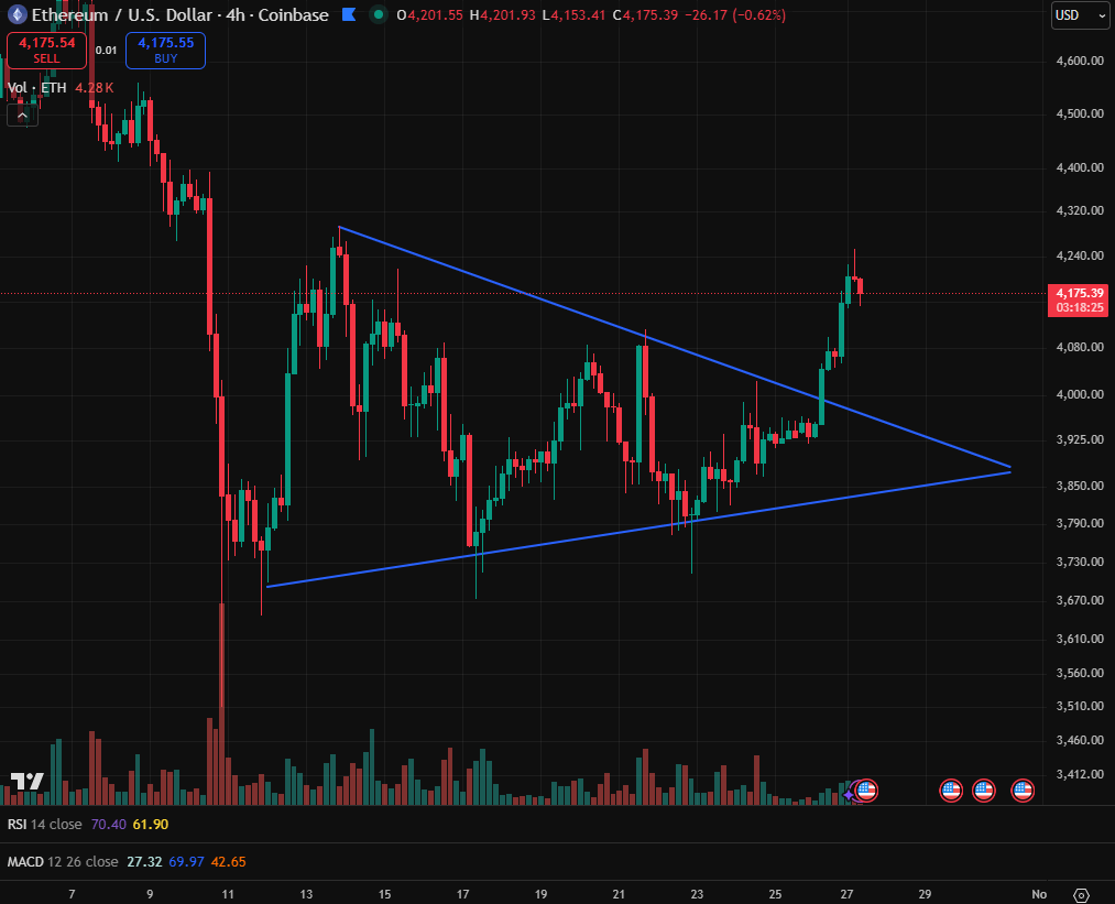 The 4-hour Ethereum chart also displays a symmetrical triangle breakout, similar to Bitcoin’s structure, signaling renewed bullish momentum after weeks of sideways movement.