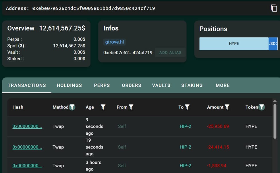 Onchain data confirms it started with a ~6,196 HYPE sell ($160K), then quickly escalated. By end of day, they’d offloaded over $10M worth.