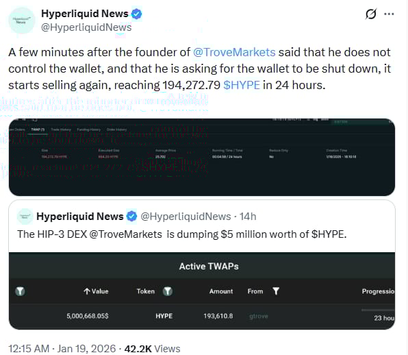 Trove Markets, a Web3 DEX platform built on Hyperliquid’s HIP-3 protocol, is under fire after allegedly dumping $10M worth of $HYPE ( ▼ 3.12% ) tokens within 24 hours 😬